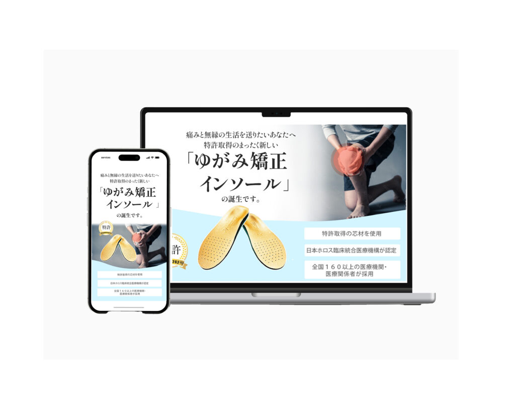 足・膝などの痛みに悩む方に向けた「ゆがみ矯正インソール」のランディングページのファーストビュー制作。